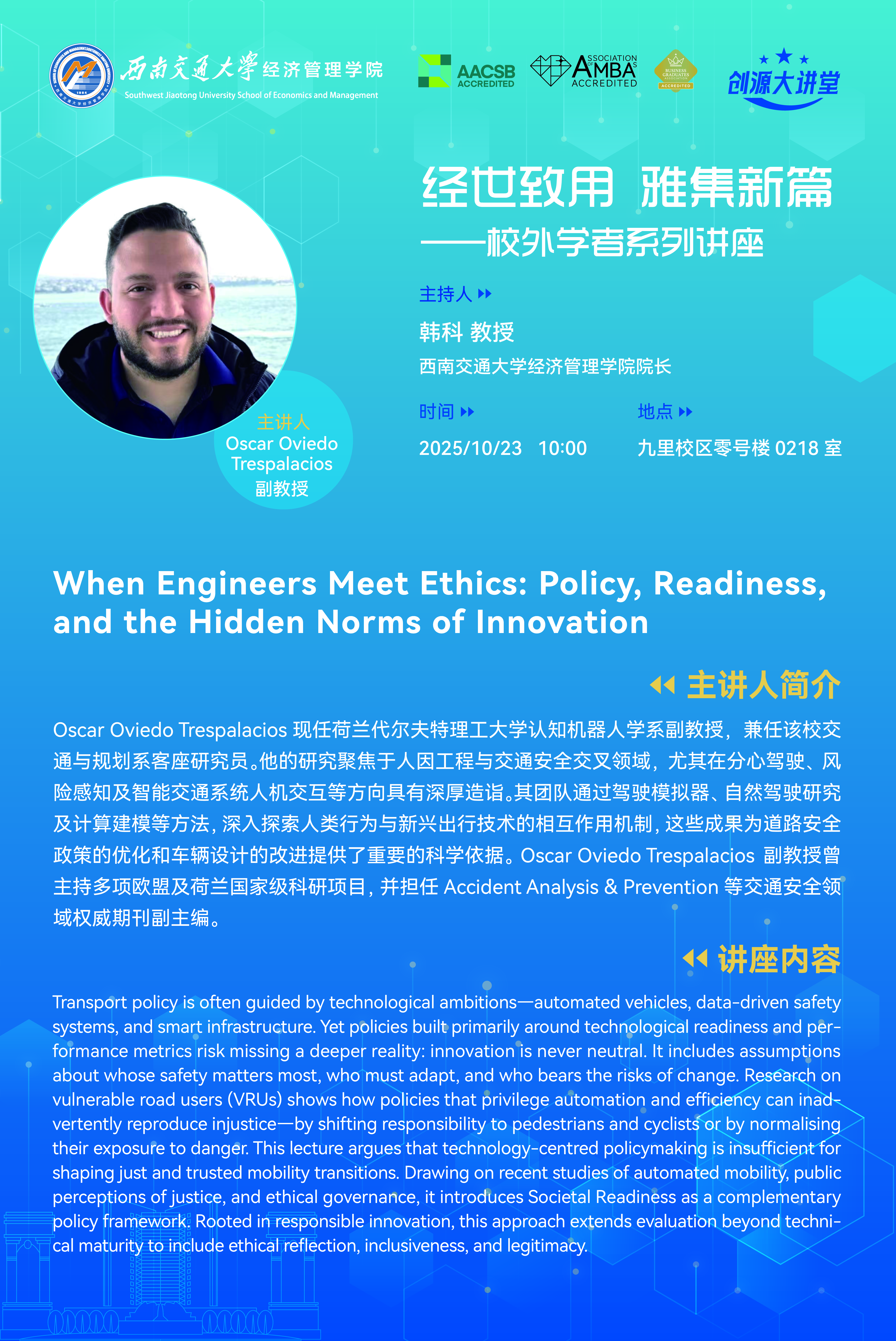 荷兰代尔夫特大学Oscar Oviedo Trespalacios副教授学术讲座