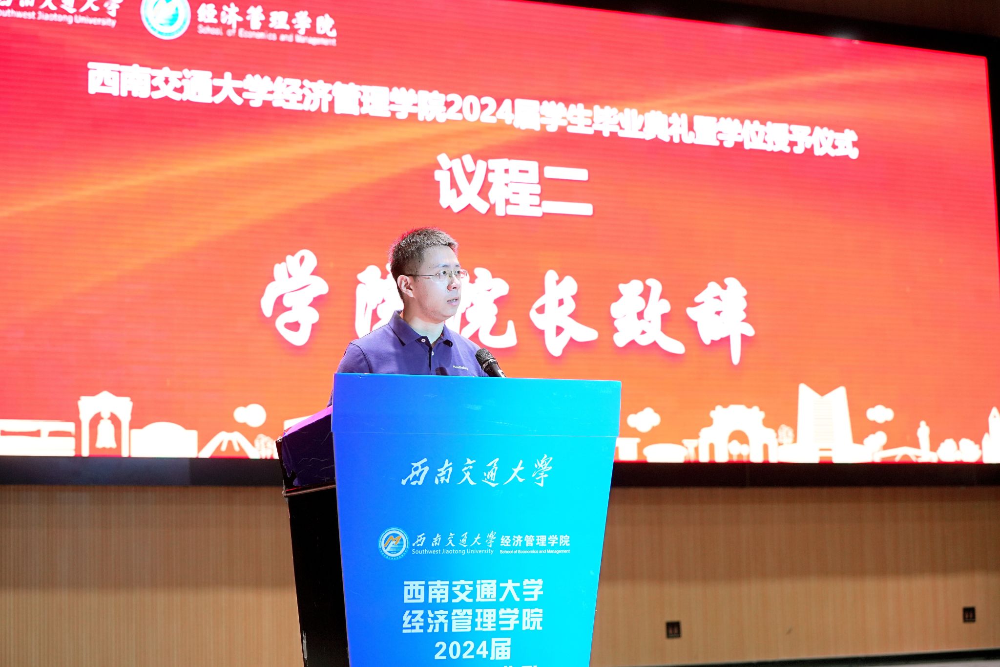 徐进老师作为全院教师代表,为2024届毕业生致临别寄语。他以大数据和人工智能为生动比喻,为毕业生们提出建议,他指出要在人生“大数据”中寻找价值,用大数据思维从生活点滴中汲取信息,明确人生方向,且要有广阔视野和包容心态,持续学习、自我优化。