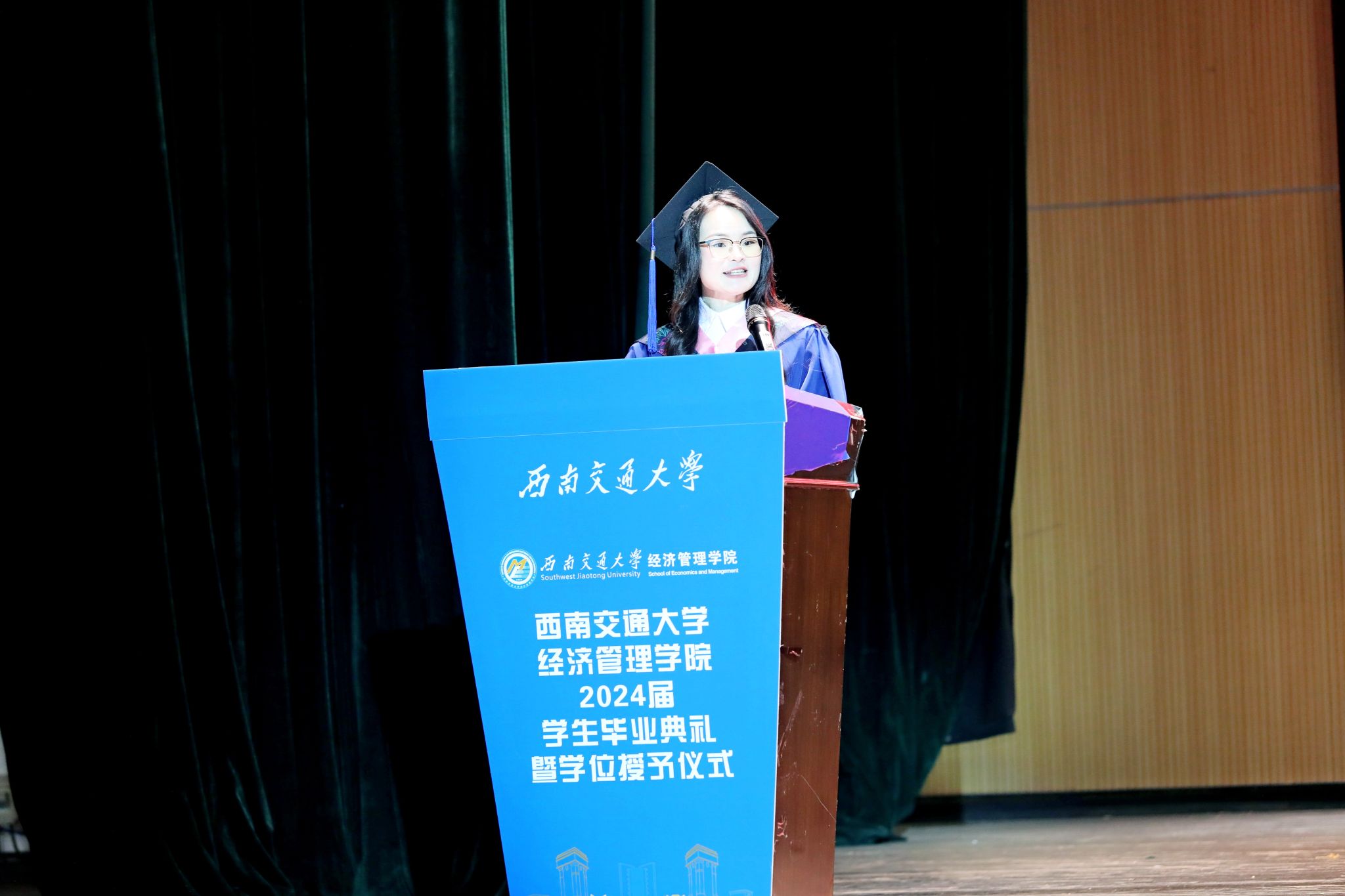 bevictor伟德2001届会计学专业本科毕业生、2016届EMBA毕业生、中国中铁西南科学研究公司党委书记、董事长谢秋秋作为员工代表发言。谢秋秋校友通过回顾自身校园时光及工作经历,深情鼓励毕业生们勇敢迈步,勇于担当,善于创新,努力奋斗实现人生价值,并叮嘱全体经管学子牢记“竢实扬华,自强不息”的交大精神,不忘师恩,砥砺前行。