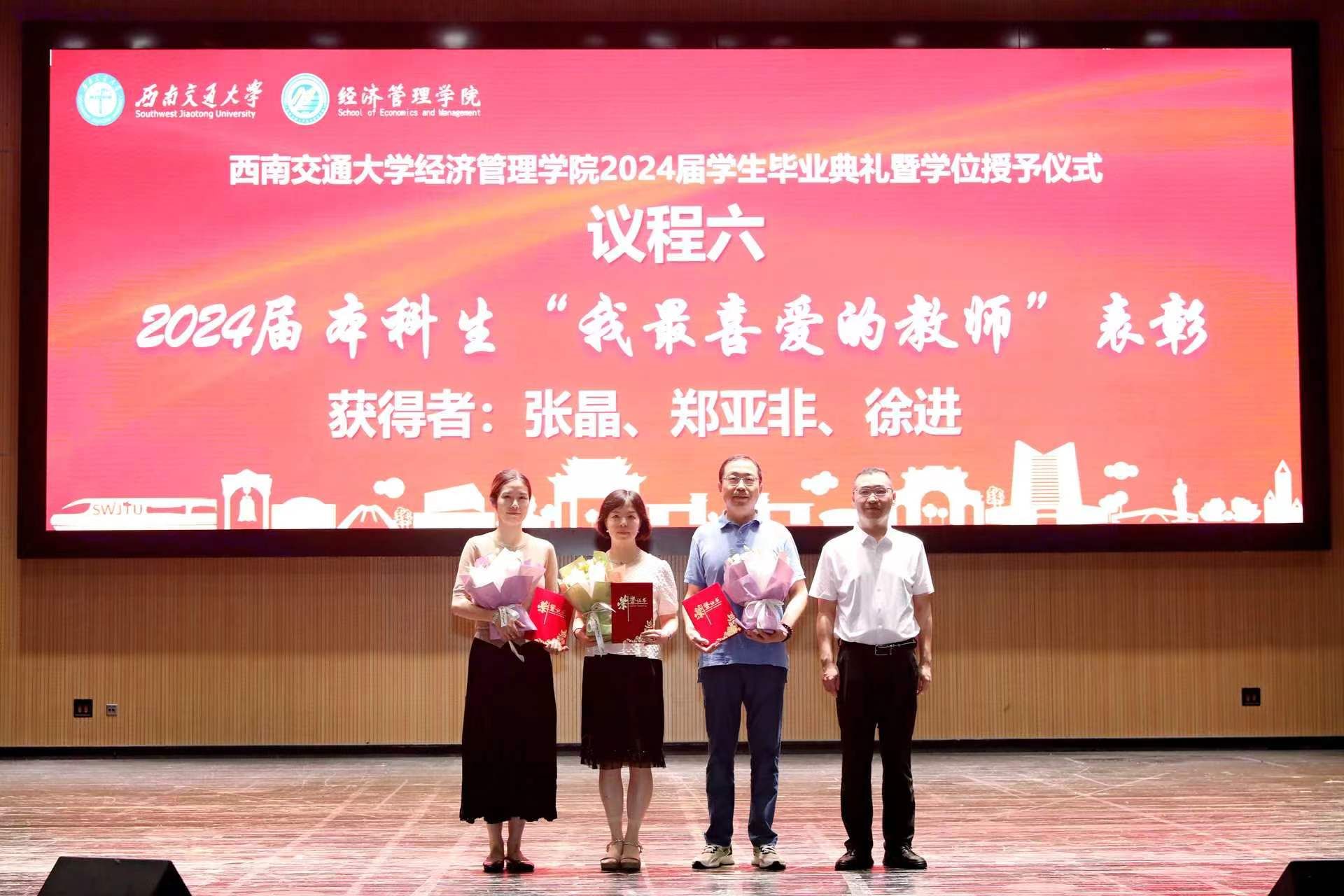 公司经理韩科宣读2024届本科毕业生“我最喜爱的教师”获奖名单,获奖老师分别是:张晶、郑亚非、徐进,副经理聂佳佳为获奖教师颁奖。