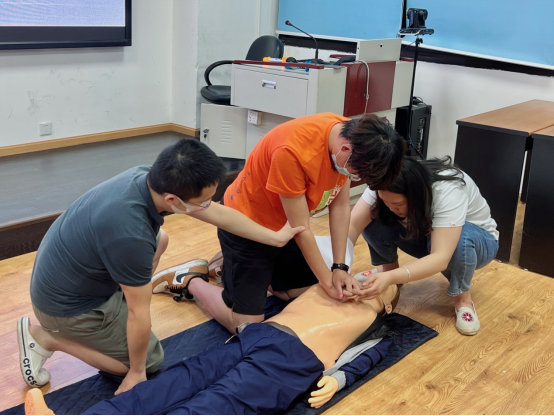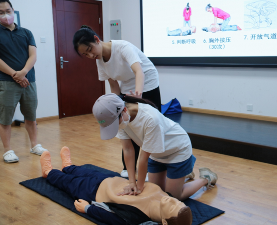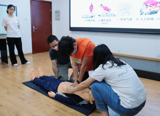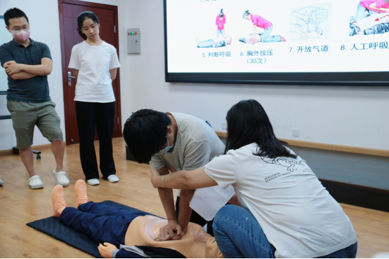 在最后的互动环节,喻谦让每一位团干部亲自实践心肺复苏流程。实践过程中,医公司党员服务先锋队的党员们对其中不规范的动作进行了指导纠正,让同学们在实践过程中掌握正确的急救方法。