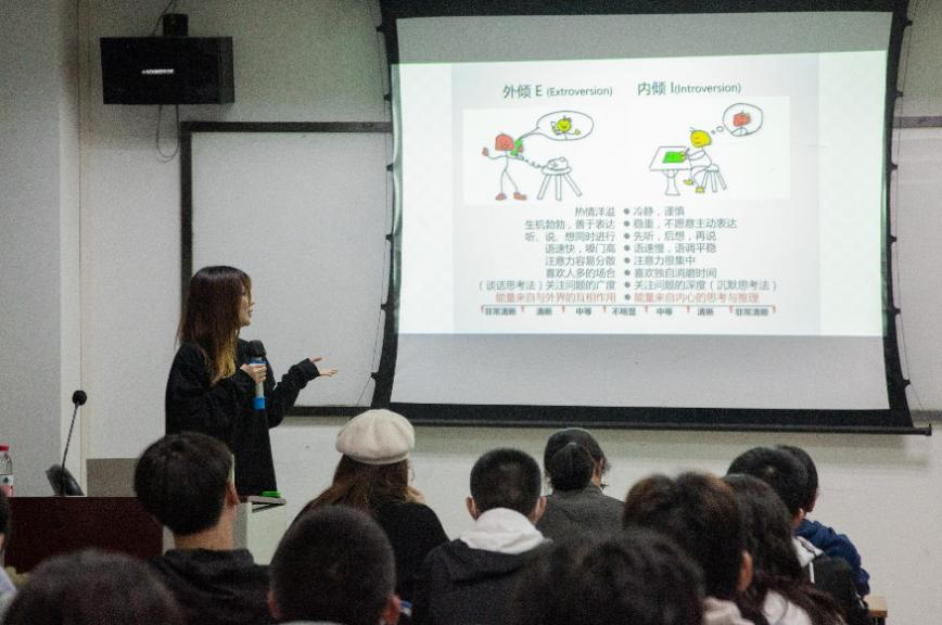 随后,尹玉萌从挑战与机遇、我的理想职场、MBTI性格探索三个板块进行讲解,让同学们更深刻地了解了当下的就业形势与职场现实,并通过MBTI微信小程序,帮助大家分析性格测试结果,以此引导同学们结合自身性格特点合理规划职业方向。