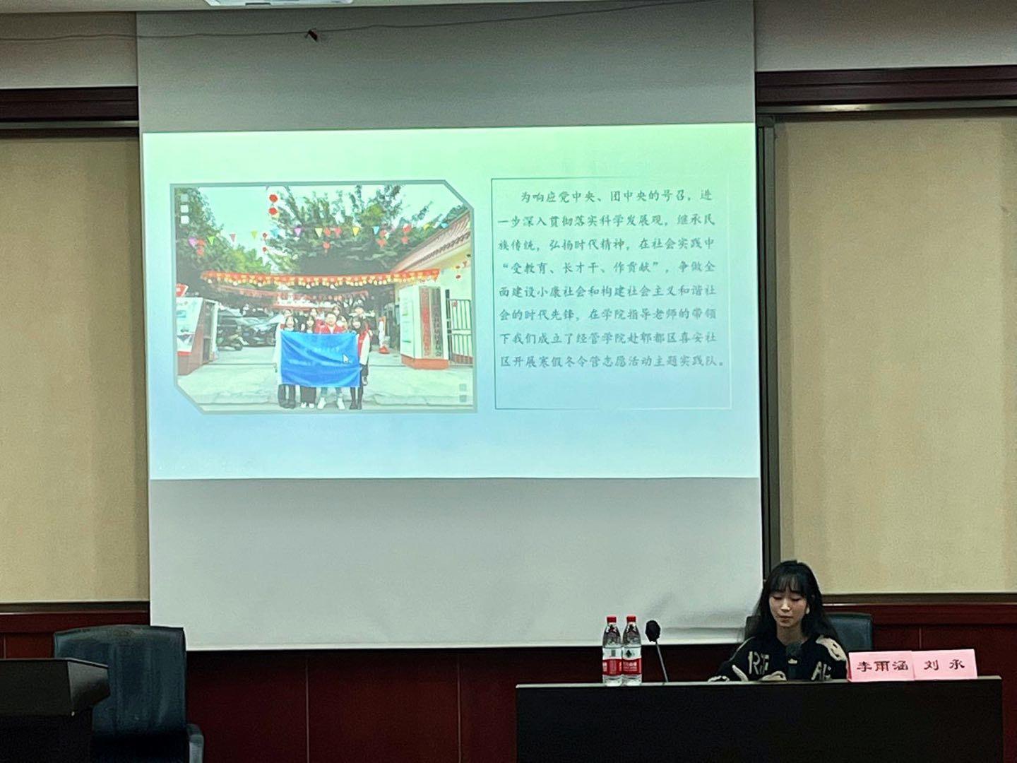 李雨涵则基于自身实践经历,先从实践背景讲起,讲解了实践对象的挑选与项目的创建等细节。随后,在介绍活动的前期准备时,她将其分为宣传资料等材料的筹备与实践地点负责人的联系两方面,分别讲解了不同准备环节中需要注意的各种事项,为同学们解决了活动筹备环节的各种困惑。另外,她还详细讲述了“冬令营”实践活动,带领同学们身临其境地感受了实践活动的过程。最后李雨涵以照片的形式展示了参加冬令营的孩子的欢乐时刻与收到的表扬信等实践成果。同学们从中再次感受到了实践活动的丰富内涵与重要意义。