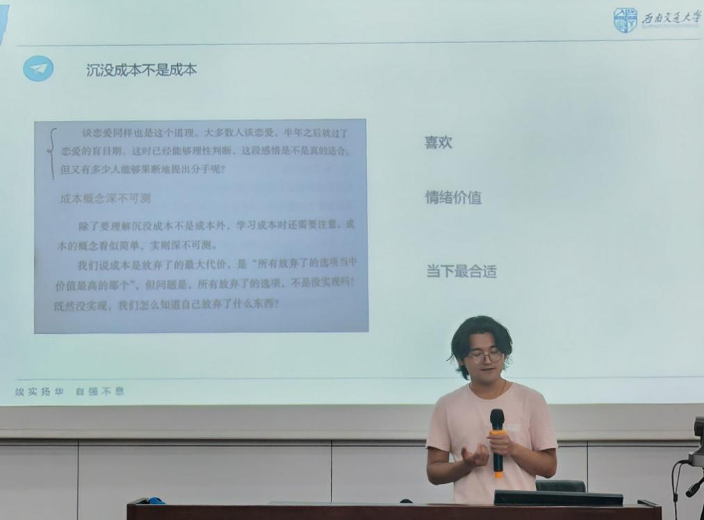 之后最后一位小组代表雷博超同学进行了读书分享,他聚焦于书中所讲的沉没成本,讲述了自己的理解与感悟。雷博超以如何实现人生目标为例,生动地解释了成本和沉没成本的概念,为接下来对沉没成本的进一步阐述做好铺垫。接着雷博超指出沉没成本并不是成本,假设性营造了一个恋爱中的成本计算案例,幽默地为同学们讲解出其中的经济学原理。最后雷博超讲道:我们要在沉没成本中重新衡量自己能获得的价值,全面考虑得失,充分尊重自己的感受,选择自己想选择的路。