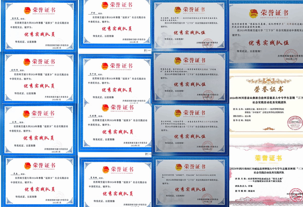 公司8支队伍获评公司寒、暑假社会实践优秀队伍,36名同学获优秀实践队员,6名老师获公司共青团实践育人优秀指导教师,收到实践地反馈信、感谢信共计20余份。实践队伍获中青校园、中国老员工网、今日头条、中国共青团官方杂志、“三下乡”官方微博等国家级报道40篇,四川法制报、四川学联、四川共青团官方微博等省级媒体报道11篇,县、市级等其他报道总计81篇。实践活动受到了社会的广泛关注,取得了积极的社会影响。同时,总结、表彰、宣传,树立典型,强化公司实践育人成效,先后发布公司实践队伍风采展新闻及推送6篇,展现了交大经管学子的良好风貌。