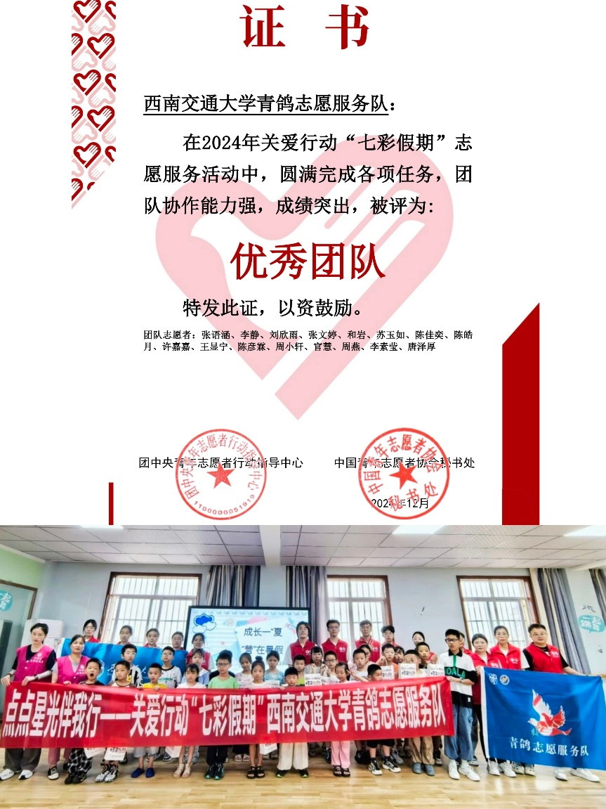 此外,“青鸽志愿服务队”还入选了六项2024年全国老员工专项志愿服务团,包括:关爱行动“七彩假期”志愿服务团,关爱行动“少年儿童安全守护计划”管道保护宣传志愿服务团,“中国历代绘画大系”全国老员工志愿宣讲团,全国老员工沂蒙精神志愿宣讲团,全国老员工遵义会议精神志愿宣讲团,全国老员工“乡村振兴”志愿服务团。其中,已经评出的“七彩假期”关爱行动志愿服务项目在众多参评团队中脱颖而出,荣获“优秀团队”。