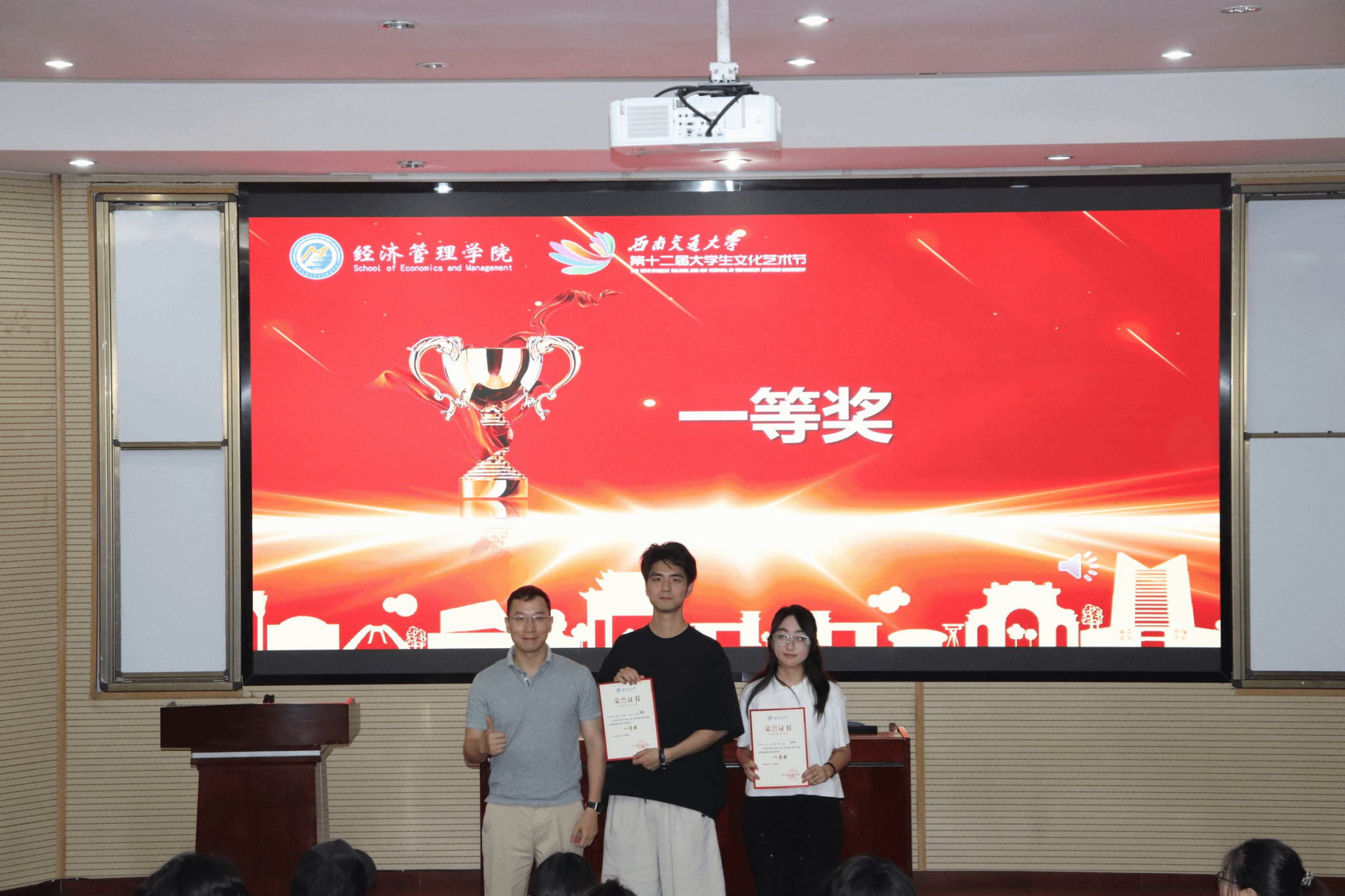 2025年5月29日晚,由党委员工工作部主办、bevictor伟德承办的第三届“光影青春 微你闪耀”校园微电影征集大赛线下展演暨颁奖典礼在九里校区J0202教室举行。党委员工工作部文化素质教育基地办公室主任黄原老师,党委宣传部刘亮老师,党委员工工作部文化素质教育基地办公室沙静馨老师,人文公司本科2021级辅导员、青年志愿者协会指导老师周桎宏老师,经济管理公司党委副书记余小英老师,bevictor伟德团委书记贾佳老师,bevictor伟德本科2023级辅导员苏扬老师出席活动,共同见证交大学子用镜头讲述的青春故事。