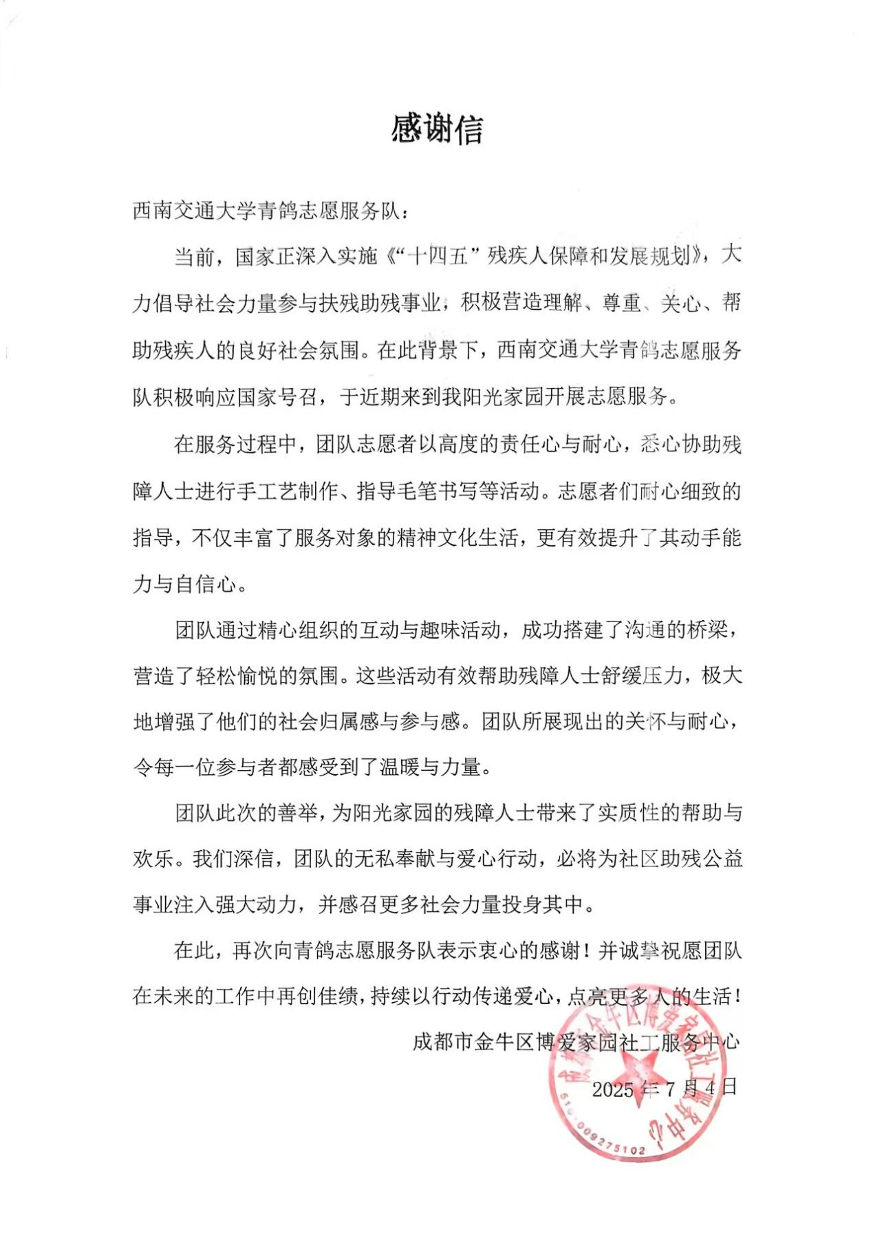 在国家大力推进残疾人事业发展、倡导社会关爱残障群体的政策背景下,伟德bevictor中文版青鸽志愿服务队积极响应号召,于近日在成都市金牛区阳光家园开展了以“众爱助残碍,群善汇福珊”为主题的专项志愿活动。此次活动专为智力障碍的“大孩子们”量身打造,通过一系列丰富多彩的内容,为他们送去关爱与温暖,助力其健康成长。