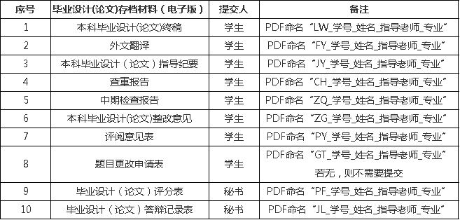 电子版按表2整理后发送至邮箱bkjyzx@126.com,发送同时务必抄送指导老师审核。邮件主题“存档_学号_姓名_指导老师_专业”,附件按表2备注中命名。电子版材料将用于后期毕业设计(论文)抽检工作,请老师同学们高度重视。
