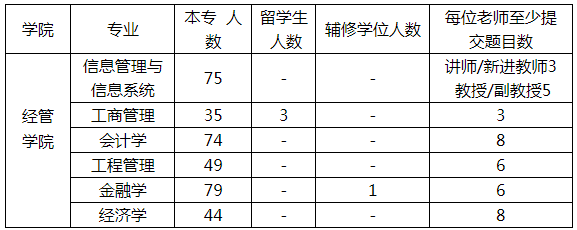4.本次题目按各系员工人数来划分最低提交数,各位老师可参考下表,老师可以在保障所要求的最低题目数量的基础上,可多提交题目,以给员工更多的选择。按教务处要求,原则上每位老师可最多指导10名员工,本届有辅修学位的员工参加毕业设计(论文)环节。