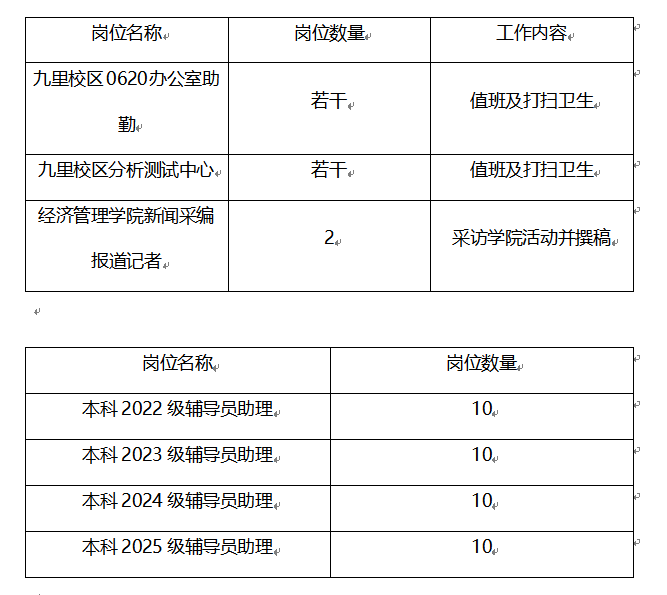 (本次招聘不面向2025级新生,新生勤工助学岗位招聘将在公司困难认定结果出来后进行。)