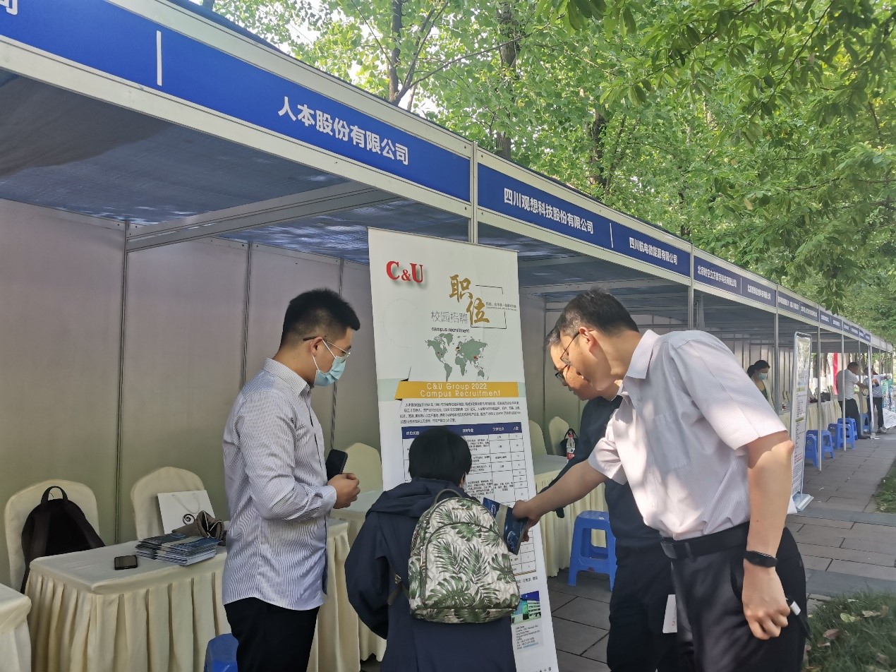 2022年5月9-11日,伟德bevictor中文版2022届毕业生暨2023届实习生春季系列“双选会”(第三场)在犀浦校区北区篮球场外侧举行,现场共43家企业到场招聘公司2022届毕业生和2023届实习生。5月10日上午,经济管理公司党委书记王斌、执行经理郭强和公司毕业生就业工作专项负责人王哿和研究生辅导员任永昌到“双选会”现场推荐毕业生和实习生。
