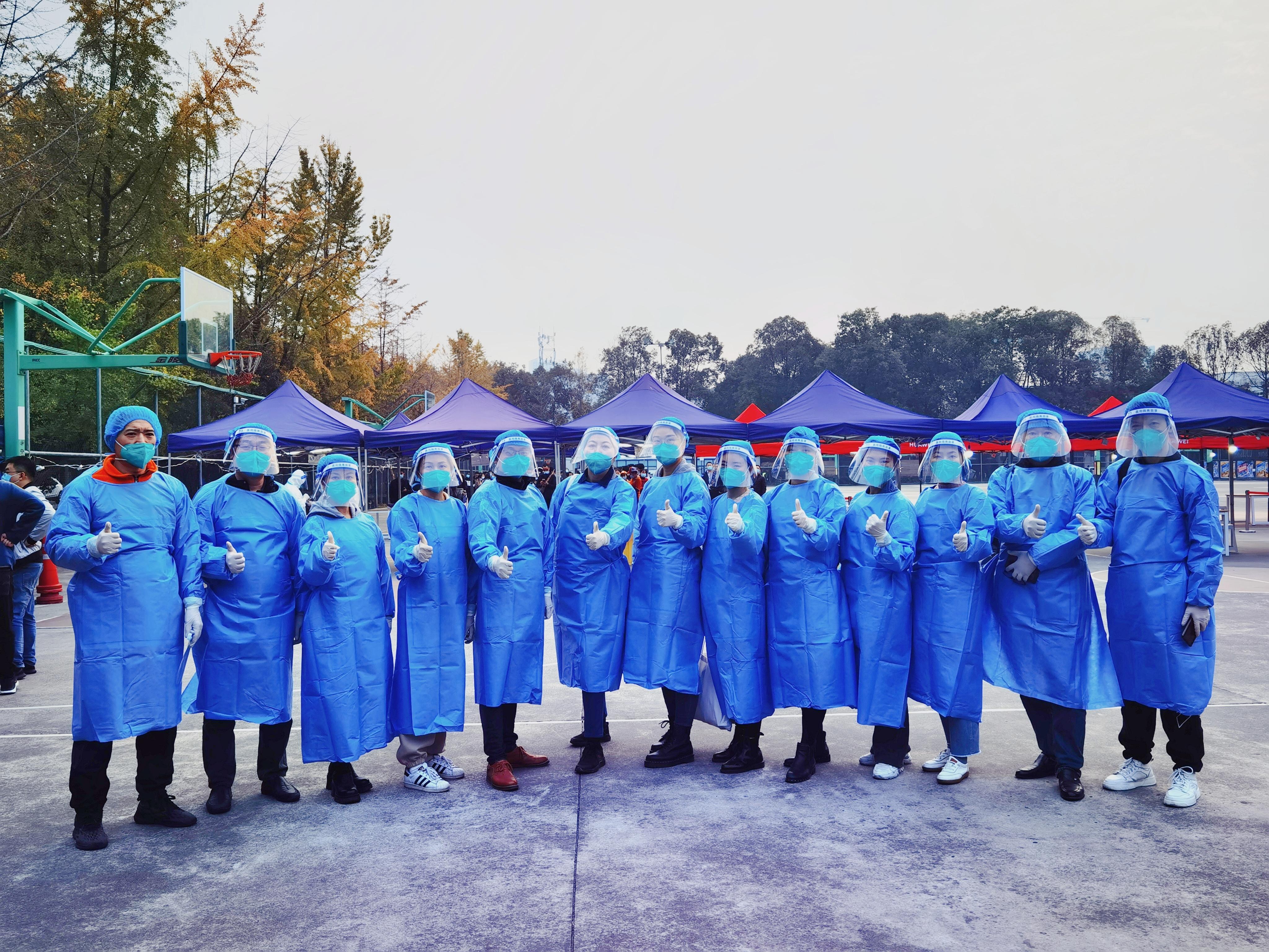 bevictor伟德通过教职工个人报名、公司党委推荐,组织了13名教职工再次担任11月24日九里校区校内核酸检测工作志愿者,协助核酸采样工作。到场参与核酸检测志愿服务工作的老师有:何鹏、罗伟民、崔长江、何建晖、尹一、漆敏、练婧曦、姚霁芸、张媛媛、王熙、向洪信、滕倩、宋洁。24日清晨7点30分,天刚蒙蒙亮,志愿者们准时到达九里校区篮球场核酸检测点,有序地领取防护物资,互相帮助完成防护服的穿戴,认真听工作人员讲解,统一学习操作流程,做好各项准备工作。
