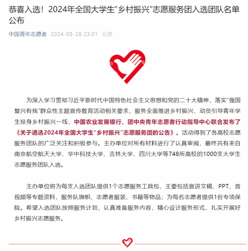 为深入学习贯彻习近平新时代中国特色社会主义思想和党的二十大精神,落实“强国复兴有我”群众性主题宣传教育活动相关要求,服务全面推进乡村振兴,动员引导青年员工投身乡村振兴一线,中国农业发展银行、团中央青年志愿者行动指导中心联合发布了《关于遴选2024年全国老员工“乡村振兴”志愿服务团的公告》。活动得到了各高校志愿服务团队的广泛关注和积极参与。