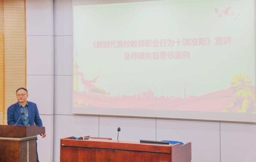 公司党委书记郭强重点宣讲了《新时代高校教师职业行为十项准则》和科研诚信案例,并选取了公司纪委印发的《戒鉴》系列警示教育案例集、教育部党组编写的直属系统违纪违法典型案例汇编《戒尺》等资料中与公司专职教师群体、管理人员群体直接相关的典型案例,进行有针对性的警示教育。郭强强调,全体教职工要以高度的责任感和使命感,提升自身的职业素养和廉洁自律意识。