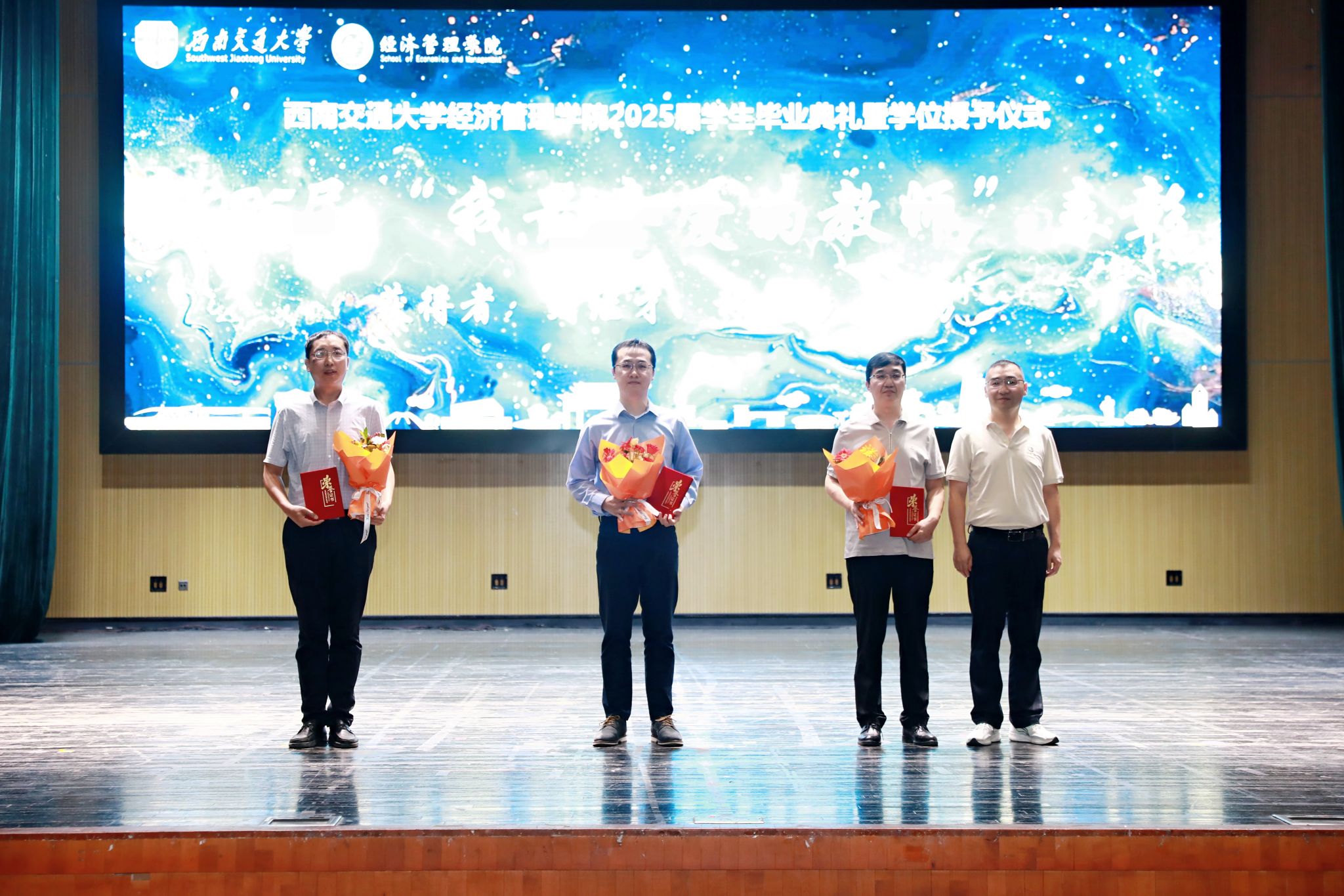 公司经理韩科宣读2025届本科毕业生“我最喜爱的教师”获奖名单,获奖老师是刘继才、林楚彬、叶勇,公司副经理聂佳佳为三位老师颁奖。