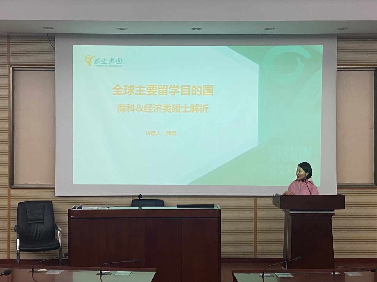 熊颖主要从全球各国留学政策以及留学申请时间规划两方面和同学们做了一些分享,她为同学们介绍了加拿大、英国、美国等不同国家留学的优点,为想要出国留学的同学们的时间安排以及材料准备上提出了一些建议。