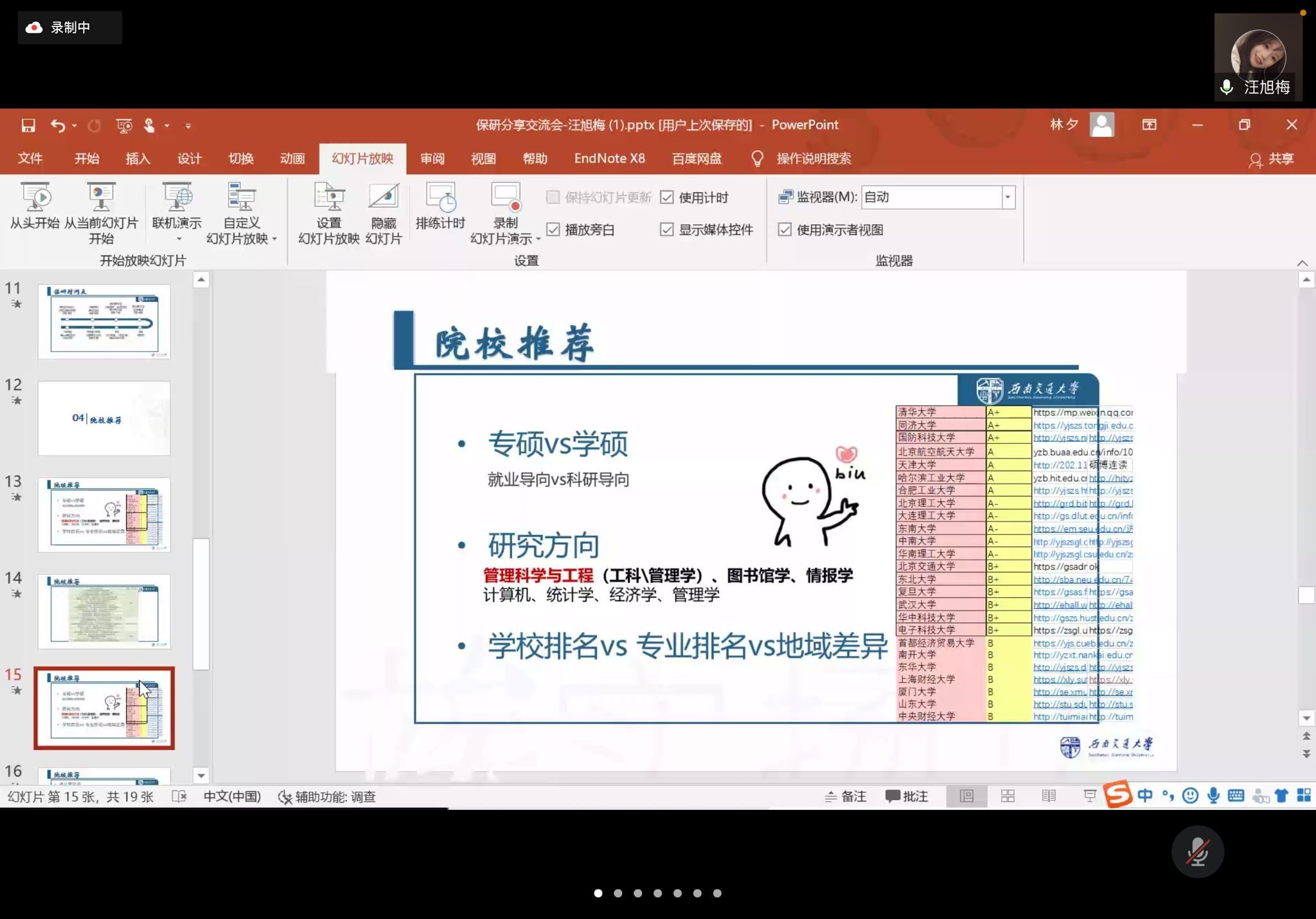 在嘉宾分享环节中,来自金融专业,保研至上海财经大学的林子渊学长和张炜尔学姐通过其个人夏令营经历、校内外保研条件、保研材料准备以及金融院校选择的分享,为同学们提供了详细的建议,并着重讲解了申请专家推荐信的方式。随后,来自信息管理与信息系统专业,保研至武汉大学的汪旭梅学姐和来自国际经济与贸易专业,保研至厦门大学的邓茗心学姐又从不同角度给同学们分享了复习经验、保研流程及保研时间点等相关信息,并提出了很多具有针对性的建议。