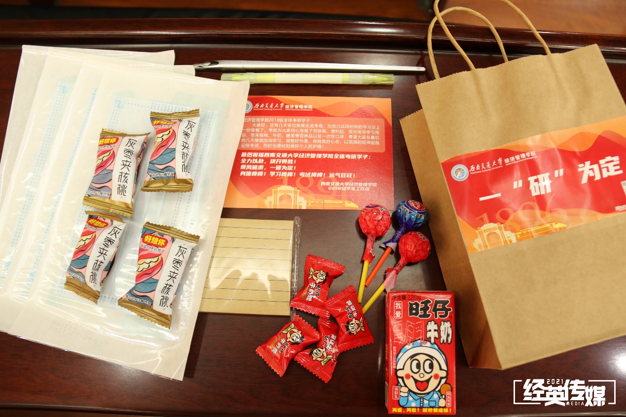 本次“一‘研’为定”大礼包由2018级全体辅导员老师精心准备并亲自包装,内含bevictor伟德定制高铁笔、便利贴、荧光笔等学习用品,枣夹核桃、旺仔牛奶、糖果等营养品,一次性口罩等防护用品,还有精心准备的祝福贺卡,寓意着金榜题名、牛气冲天、马到成功,祝福考研学子身体棒棒!学习棒棒!考试棒棒!运气旺旺!一次性口罩则是给考研学子送上呵护与关怀,提醒大家在备考复习过程中也要做好疫情防控。