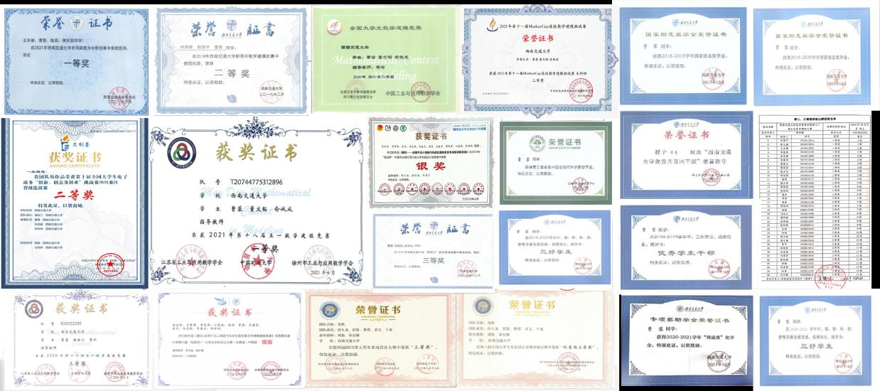 除了成绩方面,曹蓉在各项竞赛上也斩获了不少奖项,曾获得过五一建模一等奖、Mathorcup建模三等奖、全国老员工数学建模省级二等奖、“三创赛”省级二等奖、挑战杯省级二等奖等为代表的10余项奖项。拼搏进取、开拓创新是她对待这些竞赛的态度。曹蓉坦言,这些竞赛带给她的不止是一张奖状,还有在比赛过程中培养出来的意志、能力,这也是更为珍贵的。