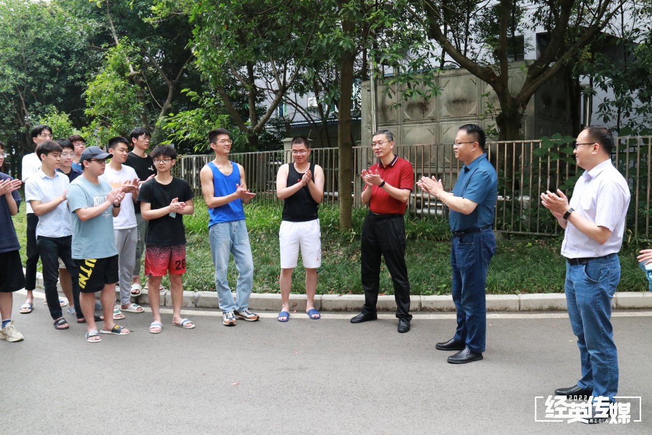 接下来大家来到了本科毕业生宿舍楼下,毕业生同学们对公司一行的到来表示热烈的欢迎。大家围在一团,书记、经理和同学们进行了亲切的交流。交流过后,郭强对同学们提出了三点期望和要求:首先祝贺大家顺利完成了大学四年的学习,希望大家走到新的岗位后,也要保持学习状态,将理论运用于实践,终身学习才能不断提升自己,为国家做出贡献;其次,要遵守校规校纪,务必注意安全,不酗酒,做到安全离校;最后,祝愿同学们在新的岗位中能取得更好的成绩,鹏程万里,交大是大家共同的家园,记得常回家看看。