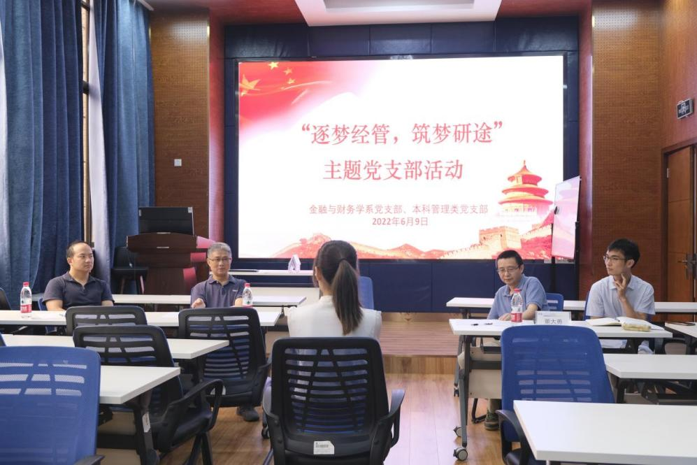 2022年6月9日下午,金融与财务学系党支部与本科管理类党支部于J0218共同举办了“逐梦经管,筑梦研途”主题党支部活动。本次活动由金融与财务学系党支部书记马锋老师指导开展,以研究生升学模拟面试为主,邀请到公司党委委员李良副经理、党委委员周嘉南副经理、朱宏泉教授、董大勇副教授、郭姝辛老师、户晗蕾老师、梁超老师、许自坚老师参与和指导。