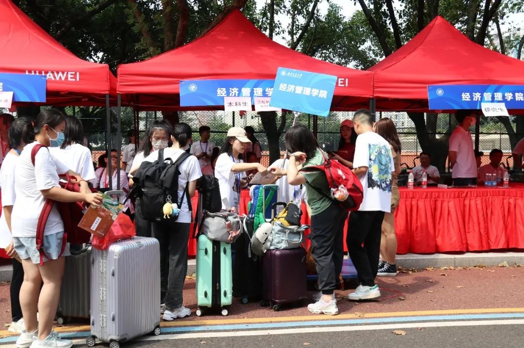 精美的欢迎宣传牌、别出心裁的手持宣传牌,彰显着经管文化,新同学纷纷打卡留念,满载欢喜和期待,院领导、班主任老师也与新同学们一起亲切合影。