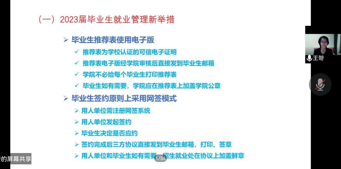 在就业与签约相关的内容讲解环节,2019级辅导员王哿老师具体从2023届毕业生就业形势、公司近年毕业生就业情况、就业管理说明、就业网签约指南、就业处联系方式等五个方面进行讲解。在讲解中,王老师用多个表格及图像直观的向同学们展示了考研、就业等的现状。对于就业管理这一版块,她将所有时间点与注意事项详细地与大家分析,同时也对同学们提出的问题进行了答疑,并在最后为同学们送上求职成功的祝福。