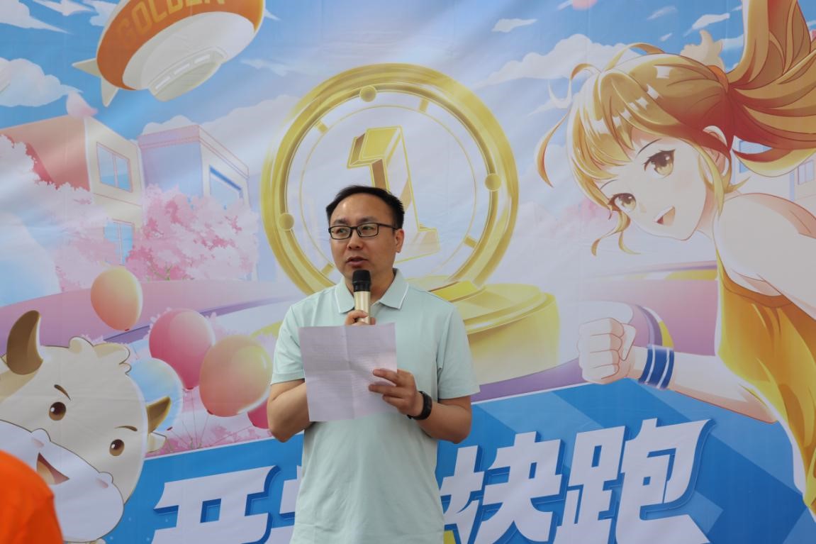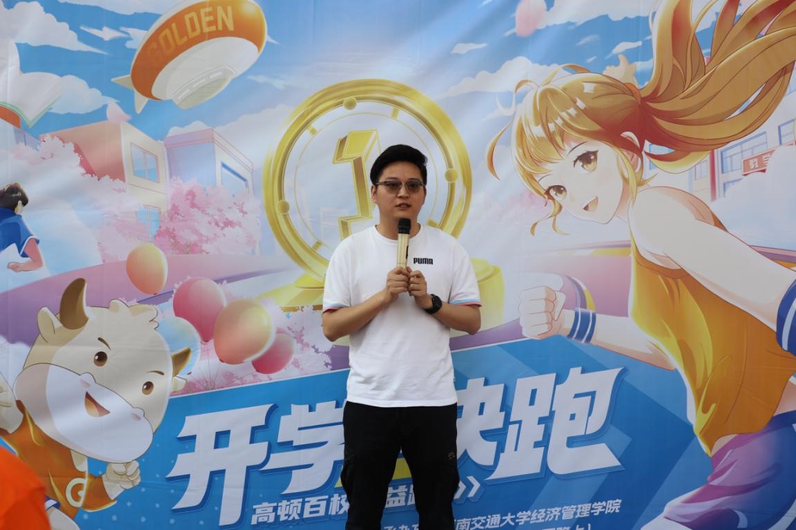 随后,经济管理公司党委副书记杨宏毅老师进行致辞。他指出健康对于我们每个人来说都是至关重要的,健康更是我们快乐学习、辛勤工作、享受生活的基础和源泉。在公司落实“五育并举”的人才培养中,在同学们自由全面发展的过程中,体育不可或缺。同学们可以多走出寝室、走向操场,融入校园体育文化活动,多参与、多接触、多感知、多收获。感悟运动、重视健康将是我们今天很重要的一个收获。致辞的最后,杨老师指出,本次“开学1块跑”的校园活动,亦希望同学们继续发扬乐观自信、坚持梦想的精神,把公益和责任相互传递,为梦想前行而努力。