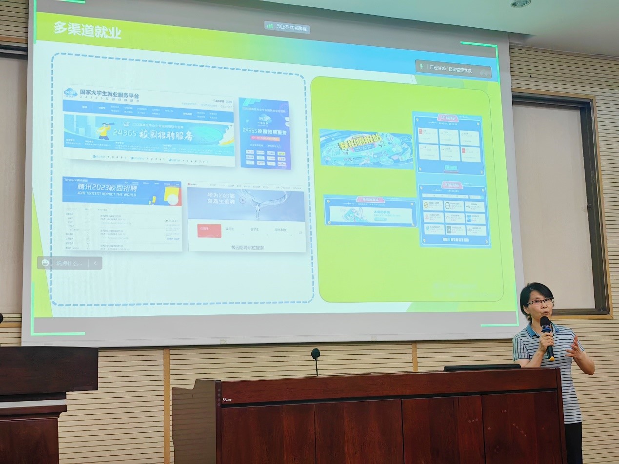 会议伊始,王哿老师针对2023届毕业生就业形势再次进行分析指导。王老师就2023年春季校招形势举例,引出就业岗位拓展难度增加、就业竞争激烈,强调同学们应该培养自己的核心竞争力,结合自身条件,多渠道就业,多方面考察就业单位,选择适合自己的工作。王老师也鼓励员工利用好公司资源,多找辅导员老师沟通交流。王老师通过对比以往数据与政策解读,深入分析考研招生现状,总结考研免研比例变化趋势,建议员工深思熟虑后再做出决策,慎重考虑硕士学历对员工的“投资回报率”,同时强调员工考研应与未来职业规划深入绑定,珍惜自己应届毕业生身份,做好个人的生涯规划,实现自我的提升。
