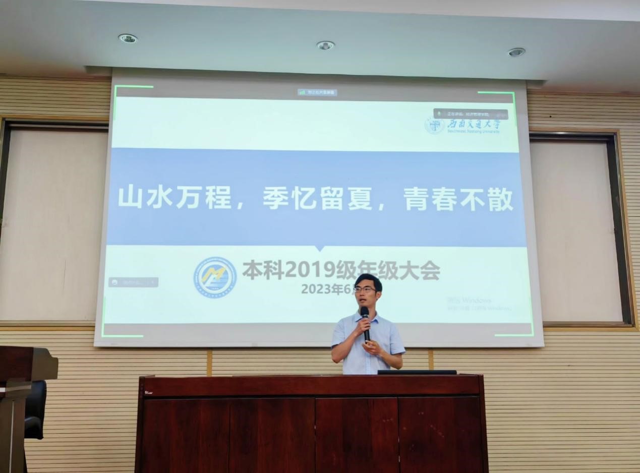 最后,苏扬老师以“山水万程 季忆留夏 青春不散”为主题对本科2019级这四年的学习与工作情况进行了梳理和总结,通报了与同学们相关的重要数据,如四六级考试通过率、升学率、毕业去向情况、升公司校等,提醒同学们在毕业之际也要遵守规章制度,对自己的未来负责,以平和感恩的心态迎接毕业,把美好回忆封存纪念。苏老师指出同学们在毕业之后也应树立终身学习的理念,希望同学们能够牢记党员的身份和使命,牢记交大学子的身份和使命,在未来不同领域发光发热,祝愿同学们美好进入下一段人生篇章和毕业快乐。