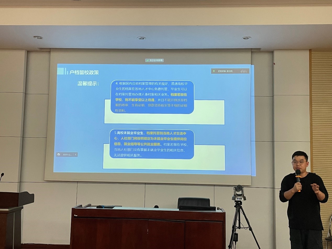 针对毕业离校工作以及户档转递相关工作,研究生部分由辅导员陈海波进行了详细讲解,本科生部分由辅导员王哿进行了具体说明。两位老师详细介绍了毕业去向登记制度,为同学们解读最新的户档留校相关政策,指导毕业生提交毕业去向流程,强调了就业信息校核的必要性以及重要性,并对公司整体离校工作安排进行讲解,对重要时间节点如毕业生体检、毕业典礼、办理离校手续等为同学们进行了说明。两位老师还在最后祝福学子们毕业快乐,在未来变得更好。