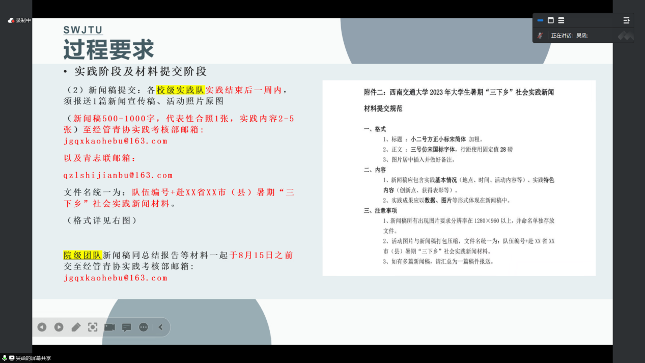 随后,培训人员详细阐述了本次“三下乡”社会实践活动的具体要求,报账流程和投稿工作,尤其对实践队伍的纪律要求和安全报备进行了详细的讲解,要求实践队伍提前购买保险,每天都必须进行安全报备,保证队伍人员的安全。