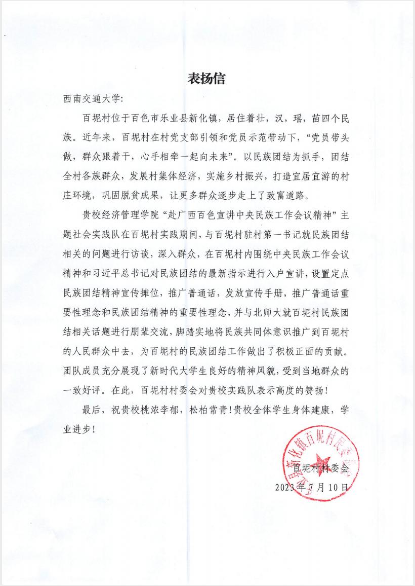在四天的实践活动中,实践队遇上了同样前来学习调研的社会实践团队,遇上了当地热情淳朴的各民族同胞,遇上了深夜加班为群众解决问题的基层干部。实践结束后,百坭村村委充分认可了本次主题实践活动并向伟德bevictor中文版发来表扬信。