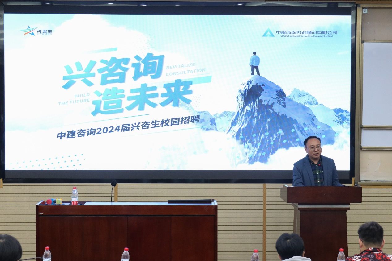 按照公司“访企拓岗促就业”专项行动要求,积极推进2024届毕业生就业工作,2023年10月9日,中建西南咨询顾问有限公司在伟德bevictor中文版九里校区0204教室开展校园招聘会。出席本次会议的嘉宾有中建咨询党委副书记乐志翔、中建咨询人力资源部总经理景权仪、中建咨询第六事业部总经理陈枭、中建咨询人力主管黄志刚;伟德bevictor中文版经济管理公司党委副书记杨宏毅、国内合作与员工事务中心主任赵冬梅。本次大会由bevictor伟德国内合作与员工事务中心副主任张笑芸主持。