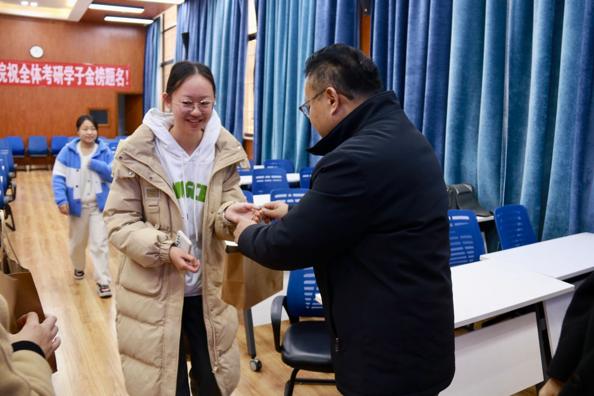 随后,公司党委书记郭强、党委副书记余小英以及2021级辅导员张先凌、钟文婷为在场的考研学子们发放了一系列寓意深刻且实用的慰问物资,包括中性笔、单词本等学习用品,以及旺仔牛奶、香橙、棒棒糖等,寓意着同学们在考试中能够笔下生花、思维敏捷,同时保持充沛的体力和愉悦的心情。此外,辅导员老师们还亲手为每位同学写下了美好的祝福明信片,字里行间流露出对同学们的深切关怀和殷切期望。