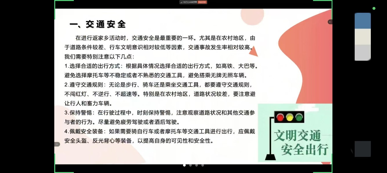 动员环节结束后,青年志愿者协会的干事细致地为各支队伍讲解“返家乡”相关事宜,围绕活动介绍、安全须知、实践要求、报账流程、投稿环节、经验分享、风采展示这几个方面展开。主讲人强调各队伍成员要严格遵循制度纪律,按时进行安全报备,保证出行安全。同时,提醒各支队伍在寒假实践期间随时关注气象变化,预防冬季常见疾病;具备完善的安全常识,做好充足的出行准备,增强救护能力。并列举了常见的极端天气与灾害自救方法以及预防冬季疾病的注意事项。特别提醒大家,各项实践活动应在保障队员安全的情况下进行,如遇突发情况应及时取消行程并向公司、公司报备。