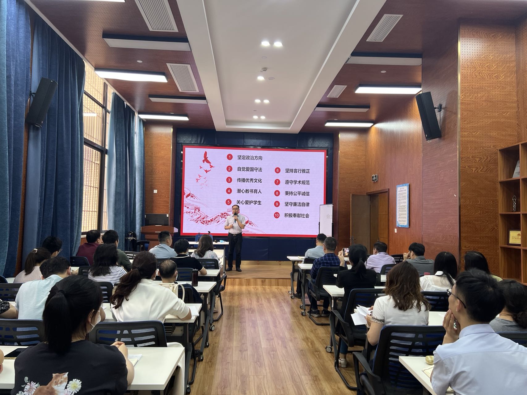 公司党委副书记杨宏毅带领大家逐条学习了《新时代高校教师职业行为十项准则》的内涵,并对应讲述了相关的警示案例。杨宏毅谈到,公司教职工要进一步加强学习党的方针政策,提高政治素养,遵守高校教师职业行为规范,言行得体,时刻以《新时代高校教师职业行为十项准则》严格要求自己。