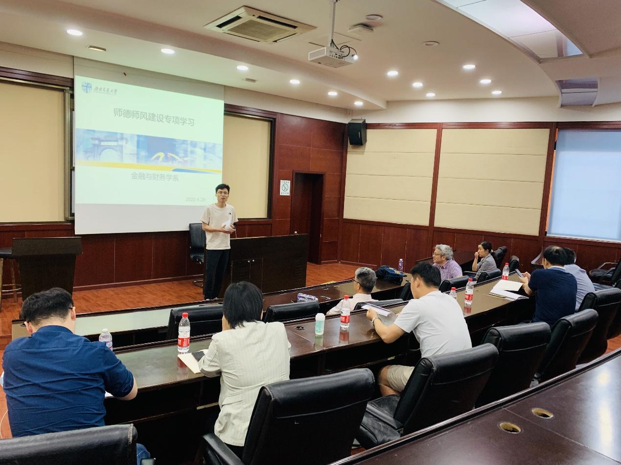2022年4月28日下午,公司金融与财务学系党支部在0224室开展师德师风建设应知应会专项学习活动。本次学习由党支部书记马锋主持,全系全体教师参加了学习。