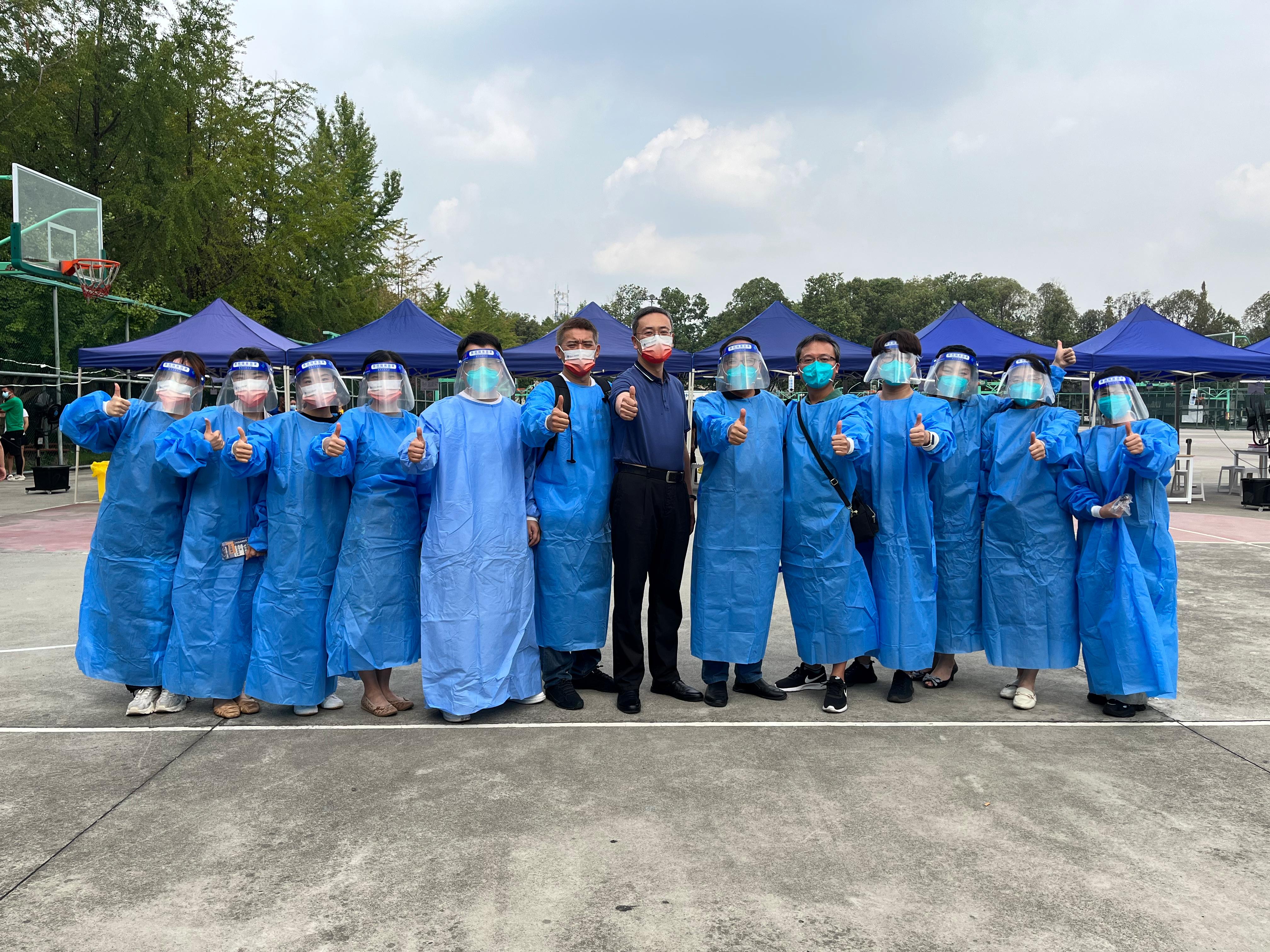 下午3时,公司12名党员志愿者老师在党委书记王斌、副书记杨宏毅的带领下来到核酸检测现场。经员工工作部副部长李毅培训和统一分工后,志愿者们先穿戴好防护用品,随即有序来到分派岗位进行志愿服务工作。