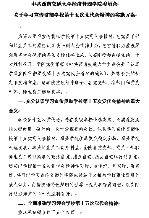 公司党委会和党政联席会强调,认真学习宣传贯彻公司第十五次党代会精神,事关公司改革发展稳定全局,事关学董事长远发展,事关师生员工切身利益。全院各党支部、党员干部和师生员工要以高度的政治自觉、思想自觉、历史自觉和行动自觉,切实把公司第十五次党代会精神学习好、宣传好、贯彻好、落实好,共同把学习宣传贯彻的实际成效转化为推动公司、公司事业发展的强大动力,建设高水平有特色、西部一流、全国知名的商公司,向着交通特色鲜明的世界一流大学奋勇前进,以实际行动迎接党的二十大胜利召开。