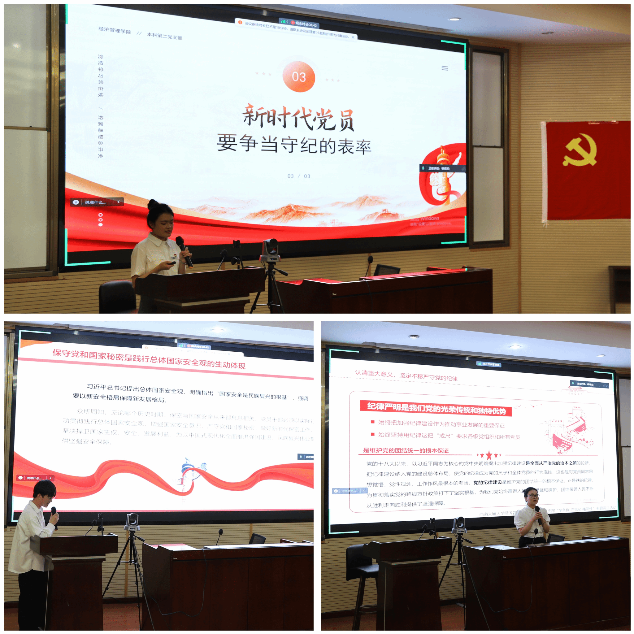结合张震宇老师、党员同志的分享以及近期的自主学习,现场的党员同志们纷纷主动发言,交流自己的收获与感悟,现场学习气氛浓厚。党员董津康谈到,党纪就如悬挂在头顶的利剑,作为一名即将步入社会的毕业生党员更要将党纪时刻放在心中,遵守党的纪律,加强自我约束,保持自我警醒,无论何时何地从事何种工作,都不能做违法乱纪的事情。党员唐天怡表示,在学习过程中深刻体会到了《中国共产党纪律处分条例》的时代性和针对性,作为一名预备党员不仅仅要学习条例,遵守条例,更要以条例为对照,常怀律己之心,做到言行一致,表里如一,不断提高党性修养和纪律意识,争做一名忠诚、干净、有担当的合格共产党员。