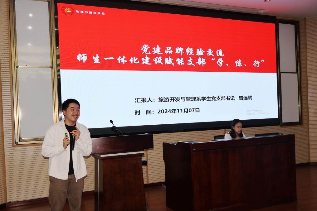接下来,成都理工大学地理与规划公司旅游开发与管理系员工党支部书记曾远航老师进行了支部工作经验分享。结合旅游管理专业特色,曾远航老师提到通过红色旅游实践、专业竞赛和“三下乡”活动,将党建与专业相结合,增强党员文化自信和责任担当,以服务乡村振兴,传承红色精神。