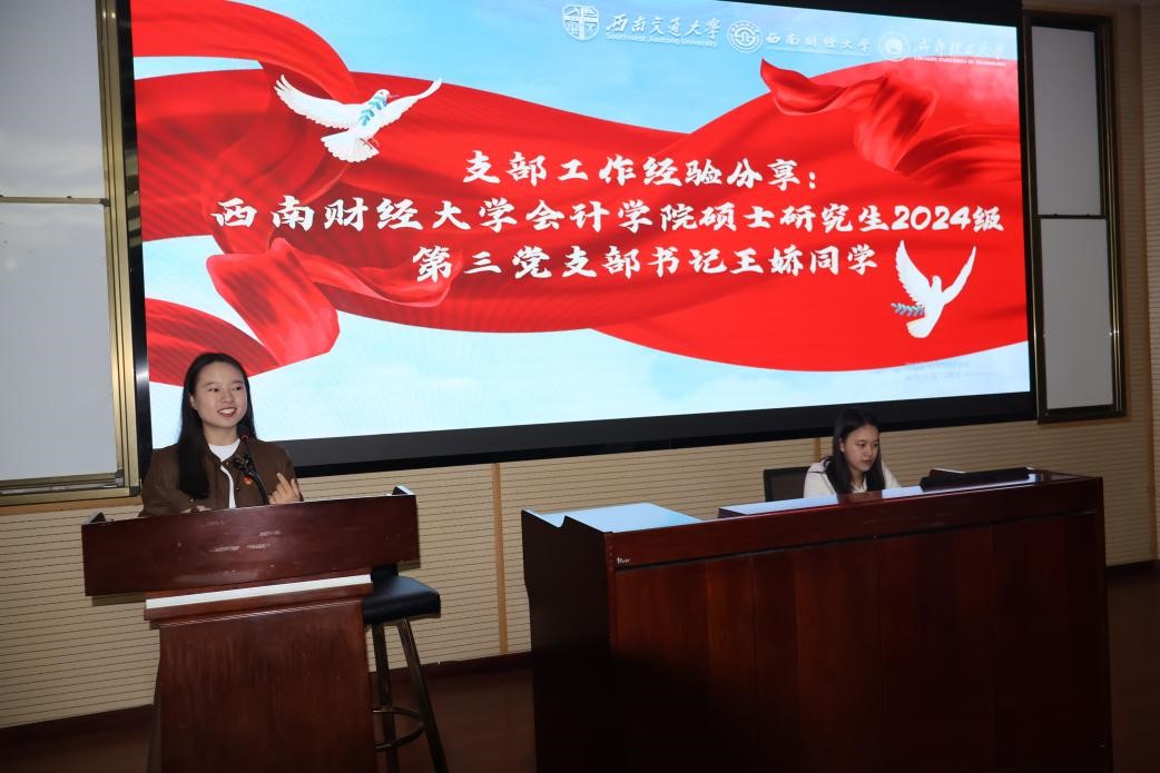 最后,由西南财经大学会计公司硕士研究生2024级第三党支部书记王娇同志带来支部工作经验分享。作为成立不到两个月的新支部,她通过明确分工、规范管理、创新活动推动支部建设,积极开展校史学习和行业交流,增强党员责任感与服务社会的意识,为后续工作打下了坚实基础。