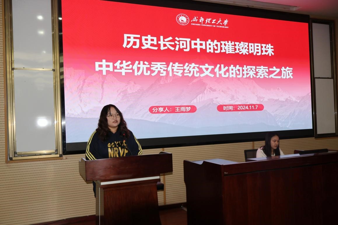 在本环节最后,成都理工大学地理与规划公司旅游开发与管理系员工党支部党员王雨梦,带来了“历史长河中的璀璨明珠:中华优秀传统文化的探索之旅”主题分享,激励大家传承和弘扬承载民族智慧与文化自信的中华优秀传统文化,在全球化浪潮下,以坚定信念推动中华民族伟大复兴。