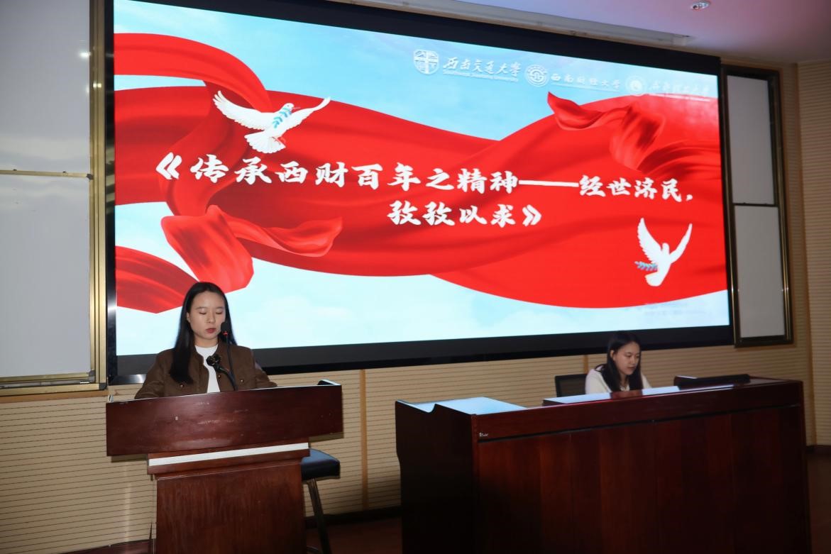接下来,西南财经大学会计公司硕士研究生2024级第三党支部书记王娇以西财百年精神“经世济民,孜孜以求”为主线,向大家介绍了西南财经大学的基本情况,展现了公司师生胸怀国计民生、刻苦钻研、探索真理、勇于实践、艰苦创业的理想追求。