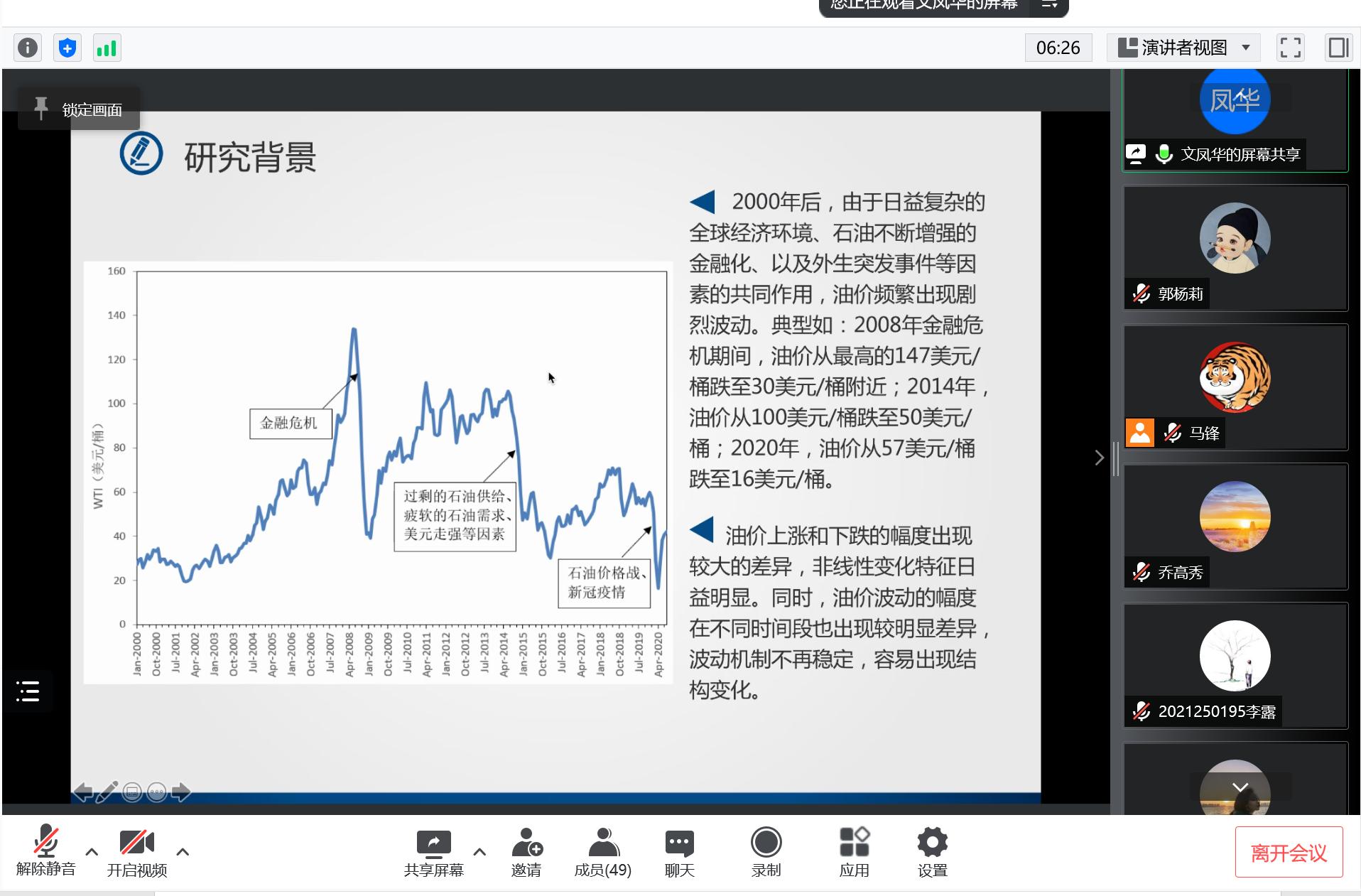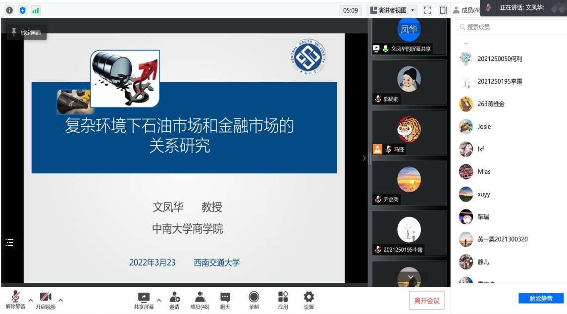 3月23日上午10点中南大学商公司文凤华教授学术讲座在线上举行,文凤华教授以“复杂环境下的石油市场和金融市场关系研究”为主题进行了精彩的分享。本次学术活动由公司金融学系马锋副教授主持,朱宏泉教授、梁超老师以及研究生参加了本次讲座。