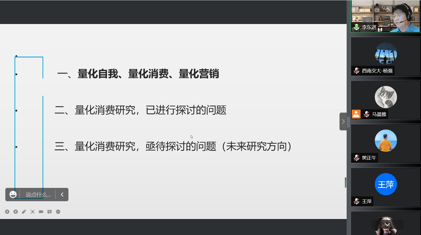 2022年5月31日晚19:30,南开大学商公司李东进教授应邀以“量化消费,到底研究哪些?”为题为公司师生进行线上学术报告。本次学术活动由公司市场学系蒋玉石教授主持,公司执行经理郭强教授以及校内外师生60余人参加了本次讲座。
