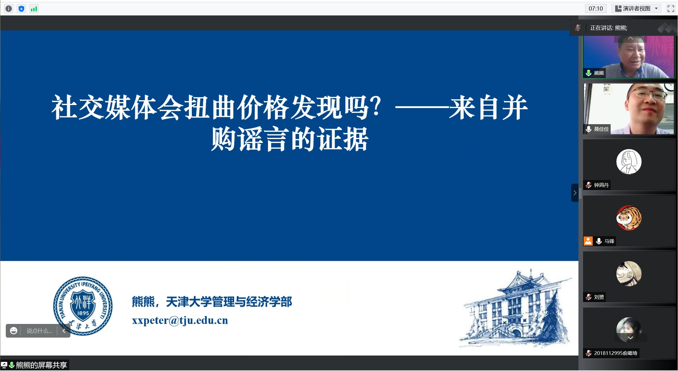 2022年6月16日上午10点,天津大学管理与经济学部熊熊教授应邀以“社交媒体会扭曲价格发现吗?来自并购谣言的证据”为题给公司师生带来一场线上学术讲座。讲座由bevictor伟德副经理聂佳佳教授主持,本次学术活动由公司金融市场与公司金融科研团队承办,金融与财务学系朱宏泉教授、马锋副教授、梁超老师及30余名研究生在线上参加本次学术活动。