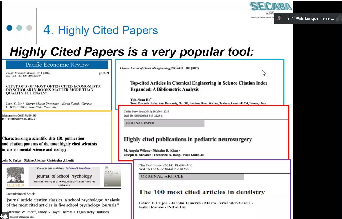 讲座分享中,Herera-Viedma教授围绕文献计量学阐述了衡量科学研究的两个主要方法:绩效分析和科学知识图谱。接着讲解并分析了H指数(H-index),高被引论文(Highly cited papers)以及高被引科学家(Highly cited researchers)在科研学术中的评估界定方法。随后教授分享了他们在SECABA实验室开发的两个文献计量学工具:H-Classics和SciMAT。H-Classics是一种基于H指数的高被引论文识别方法。SciMAT是一款可视化分析软件,主要基于文献计量指标进行科学知识图谱解析。